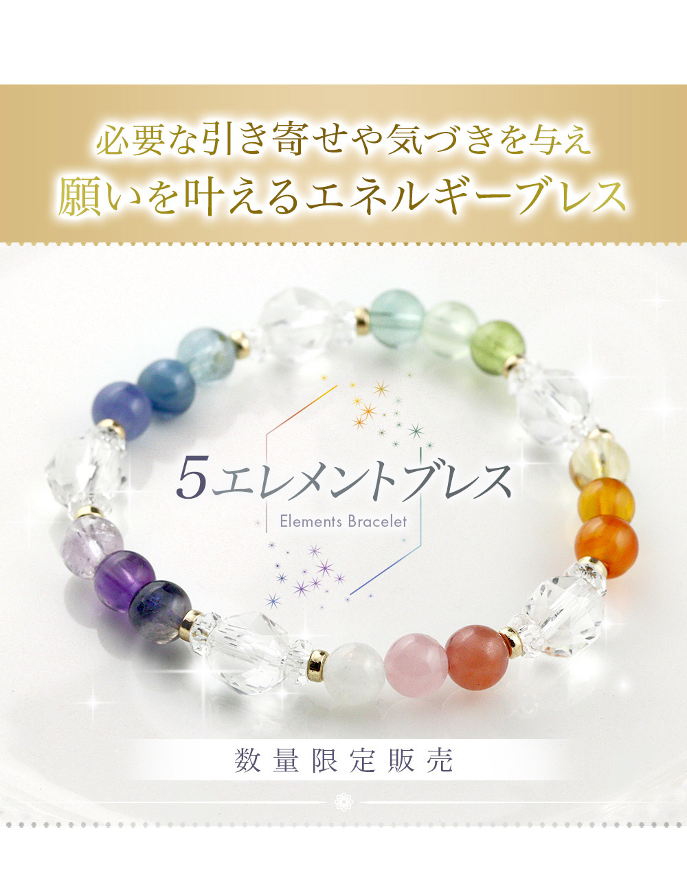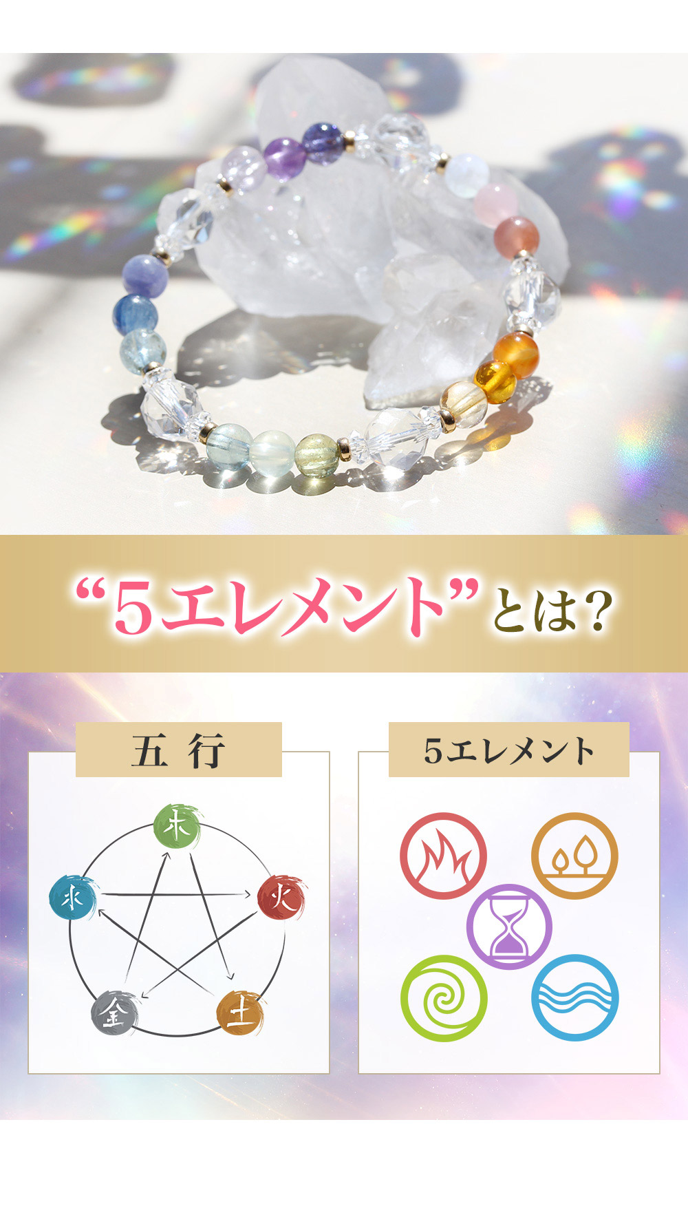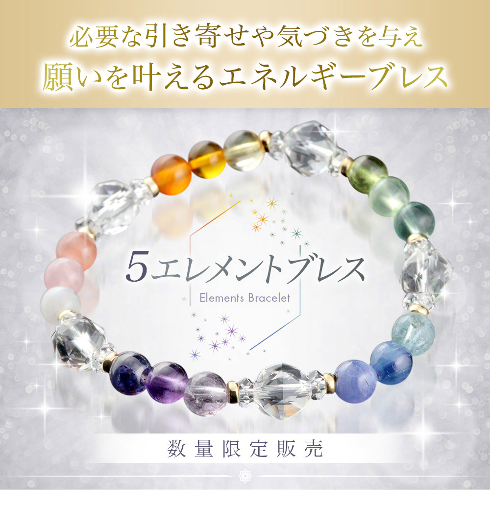 5エレメントブレスは、15種類もの石を属性ごとに分け、エネルギーを効果的に使えるように組み合わせた、特別なブレスレットです。