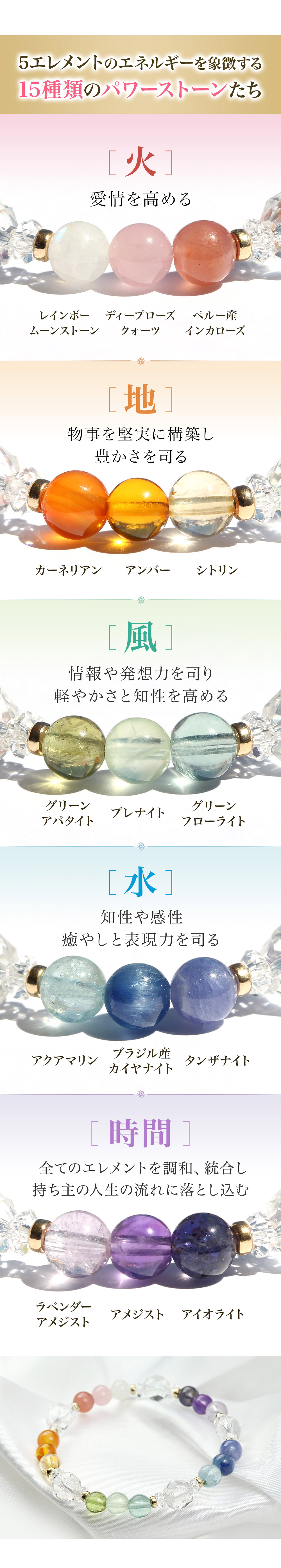 使われている石は、それぞれがそのエレメントのエネルギーをバランスよく象徴する石として選ばれています。